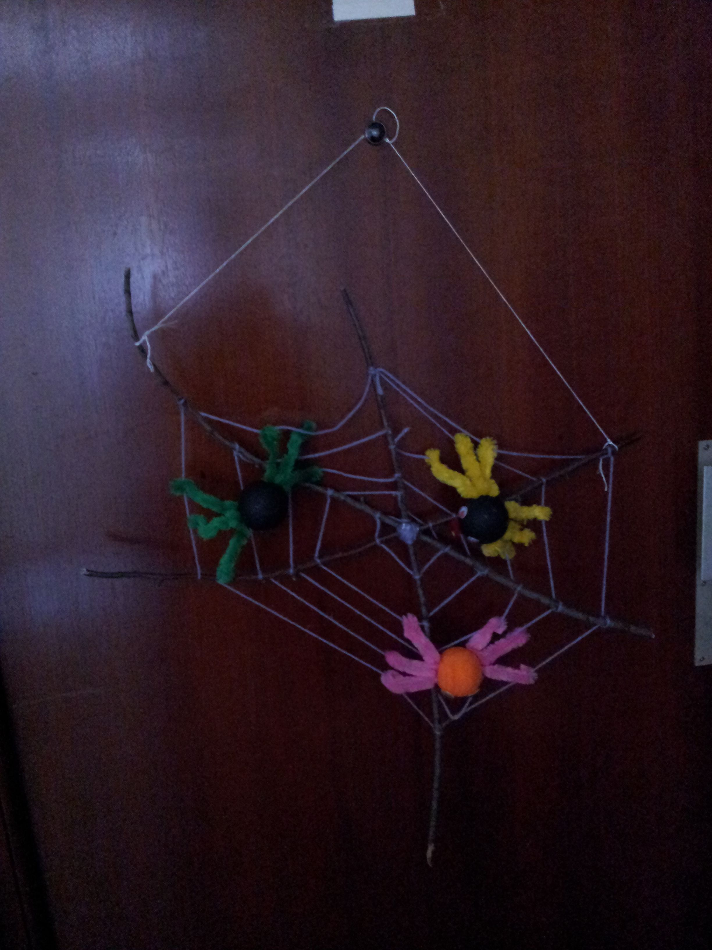 Notre déco de porte pour cet halloween 2012, une toile d'araignée faite avec des branches d'arbres ( mon fils adore en ramasser quand on se promène, dommage qu'on ait pas de cheminée avec tout ce qu'il me ramène ^^) et de la laine pour la toile.