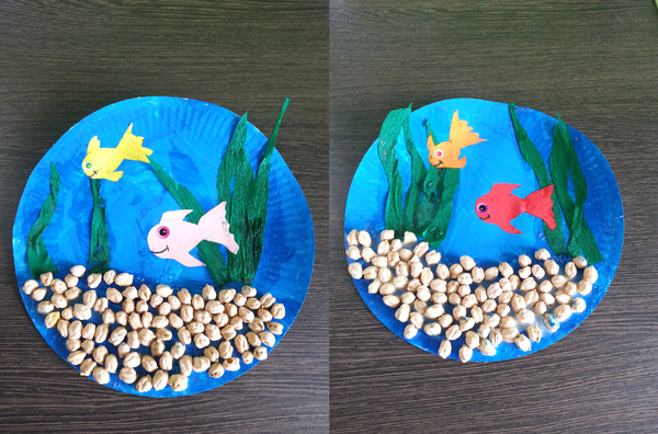 Peinture de l'assiette, collage de pois chiche pour faire le fond de l'eau, papier crépon pour faire les algues et collage de petits poissons, le tout en chanson ;)