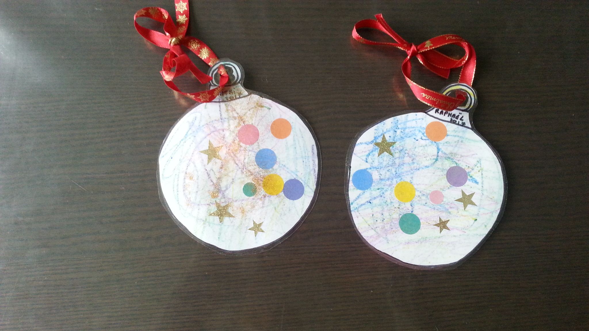 Aujourd'hui les garçons ont colorié recto verso des boules de Noël que je j'ai dessiné puis ont collé des gommettes dessus;Iils ont mis un peu de paillettes et je les ai plastifié après.