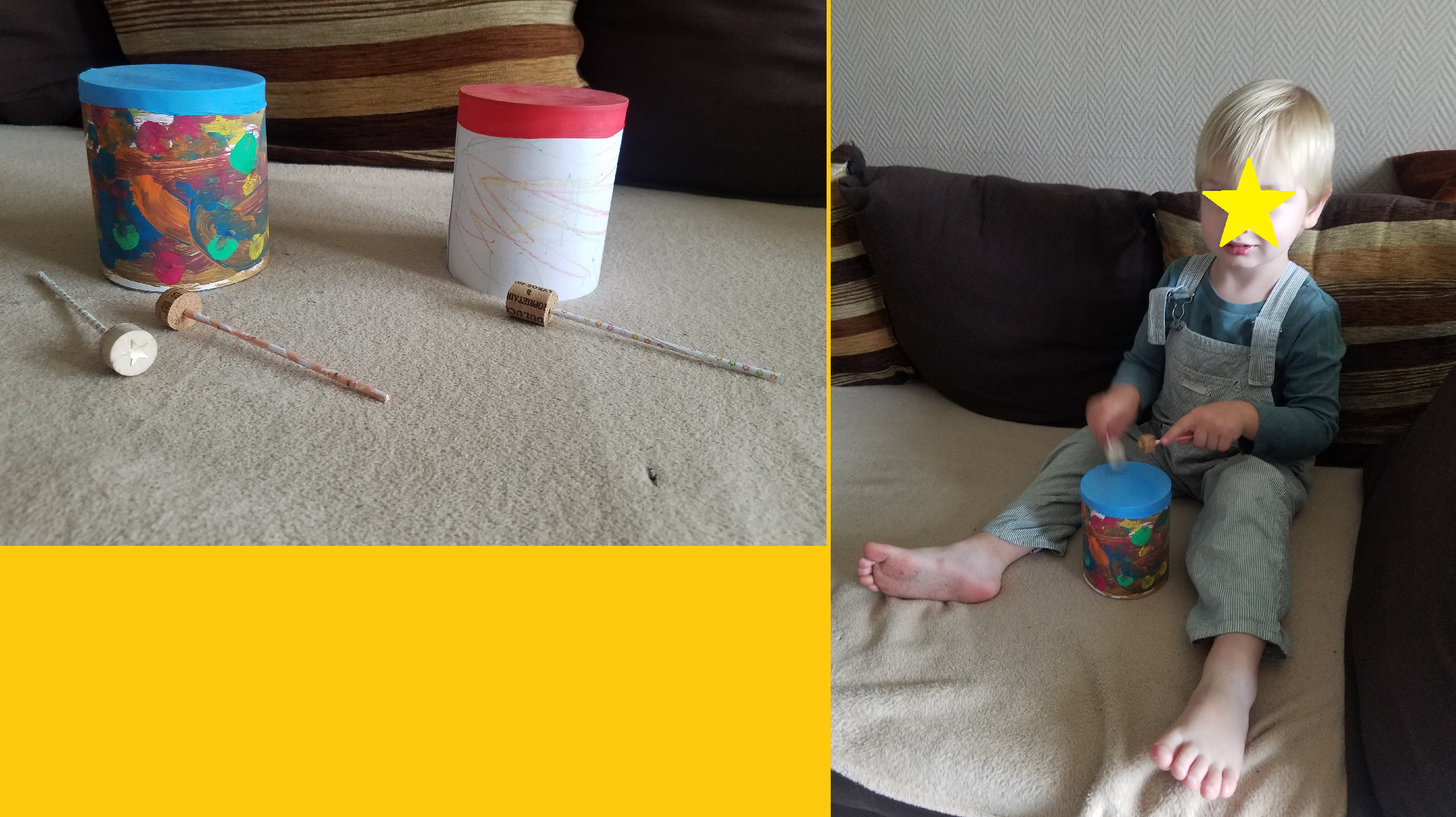 Et voila les instruments des garçons pour cette fête de la musique de la musique 2019 : des tambours fabriqués avec des boites de conserve, un ballon et pour les baguettes: des pics à brochettes et un bout de bouchon.